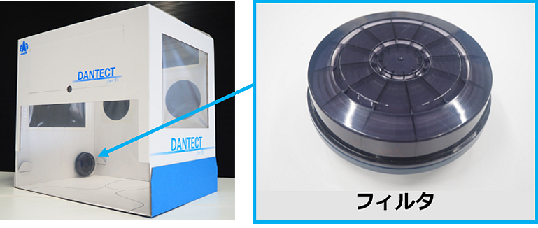 そこで当社では、マスクメーカーとして培ってきたフィルタ及び気流制御の技術をベースに、東邦大学医学部微生物・感染症学講座、同麻酔科学講座、東邦大学医療センター大森病院感染管理部、同先端健康解析センターと共同で改良を重ね、これまで市場になかった陰圧化と小型超高性能フィルタによる高い安全性を持ち、作業性にも優れた使い捨てできる気管挿管・抜管用フードを開発しました。